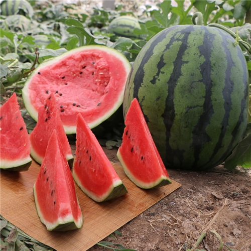 植株长势强,雌花多,雄花花粉活力强,易座果。果实发育期40天左右,果实椭圆形,果皮底色绿色,覆盖绿色锯齿状条纹,蜡粉少,果肉红色,剖面均匀,质地细腻,不易水脱,中心糖度12度左右,口感酥脆甘甜。